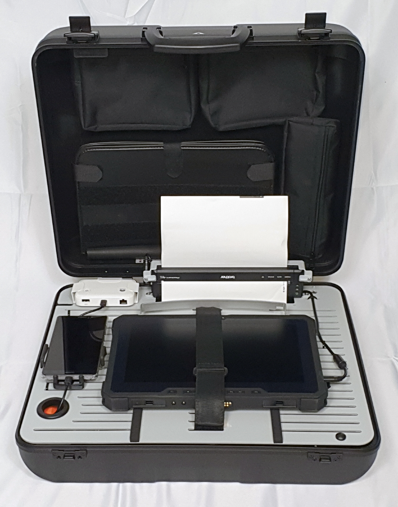 | Konfiguration Systemplatte | Universal Alu Systemplatte für Tablet PCs, Version für DELL Latitude 7220 ruggedized Tablet PC, Universal Handyhalterung bis 7 " mit USB Kabelanschluß, WWAN Hotspot Halterung mit USB Kabelanschluß, Druckerhalterung für BROTHER PJ mit Stromanschluß, Moosgummiprofile, variabler Universal Ständer |