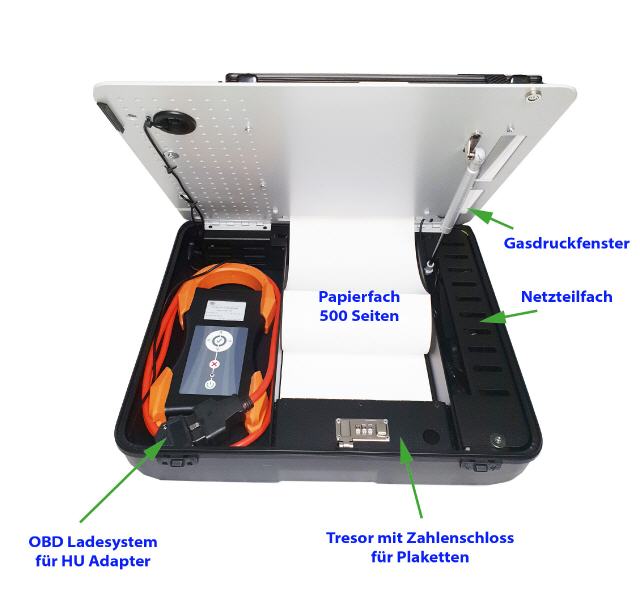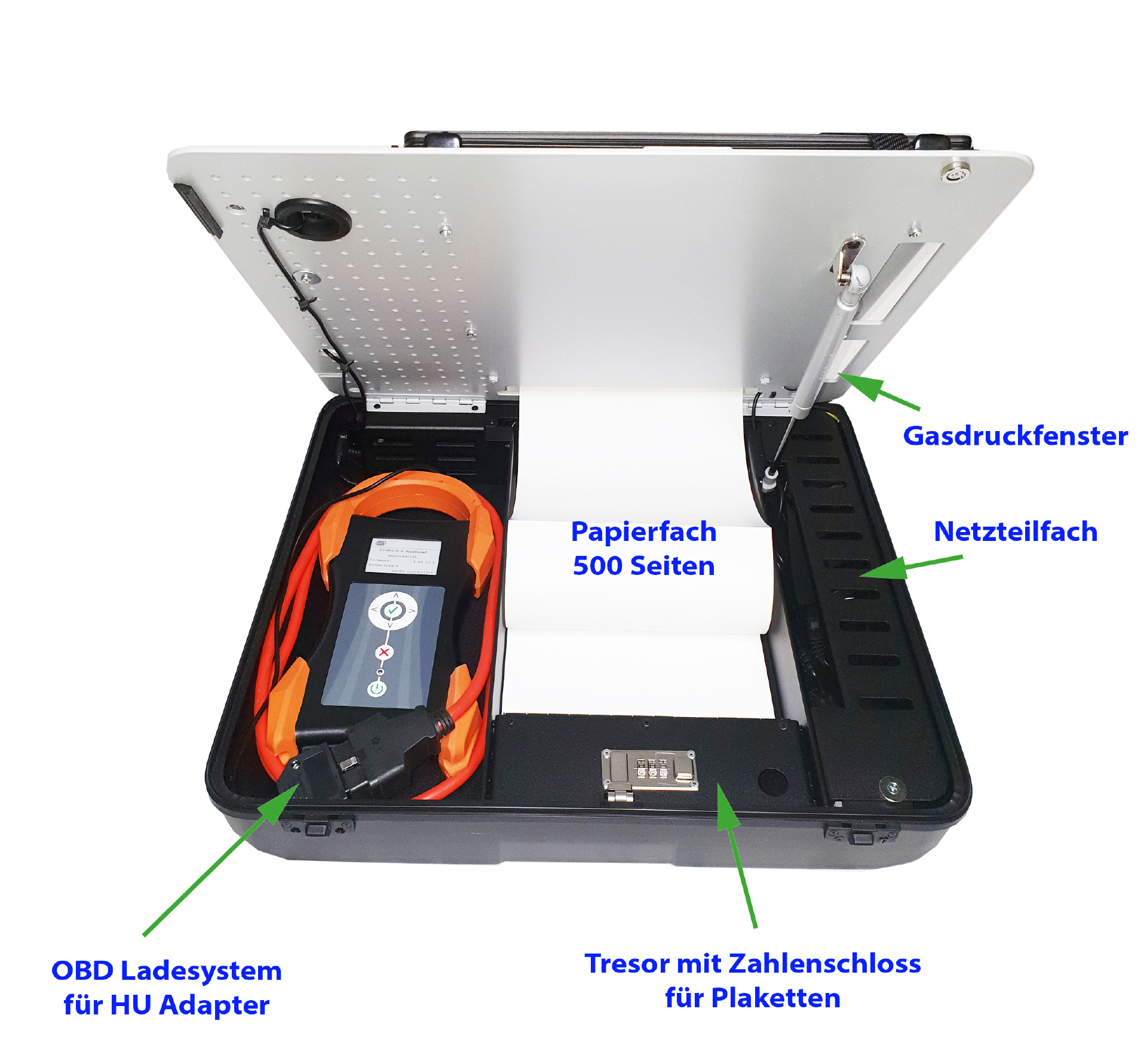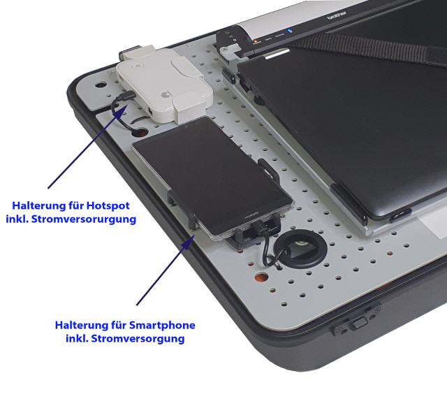 Zweigerätelösung mit Handy-Halterung und WLAN-Hotspot, integrierte Netzteile Universalhalterung 10 bis 18 Zoll Geräte Ladestecker OBD für HU-Adapter-Ladefunktion, grosses Papierstaufach, geschütztes Technikfach, Gasdruckfeder, abschließbares Plakettenfach Halterung für Smartphone und WWAN Hotspot inkl. USB-Ladestecker Formschöne und stabile Kofferschale