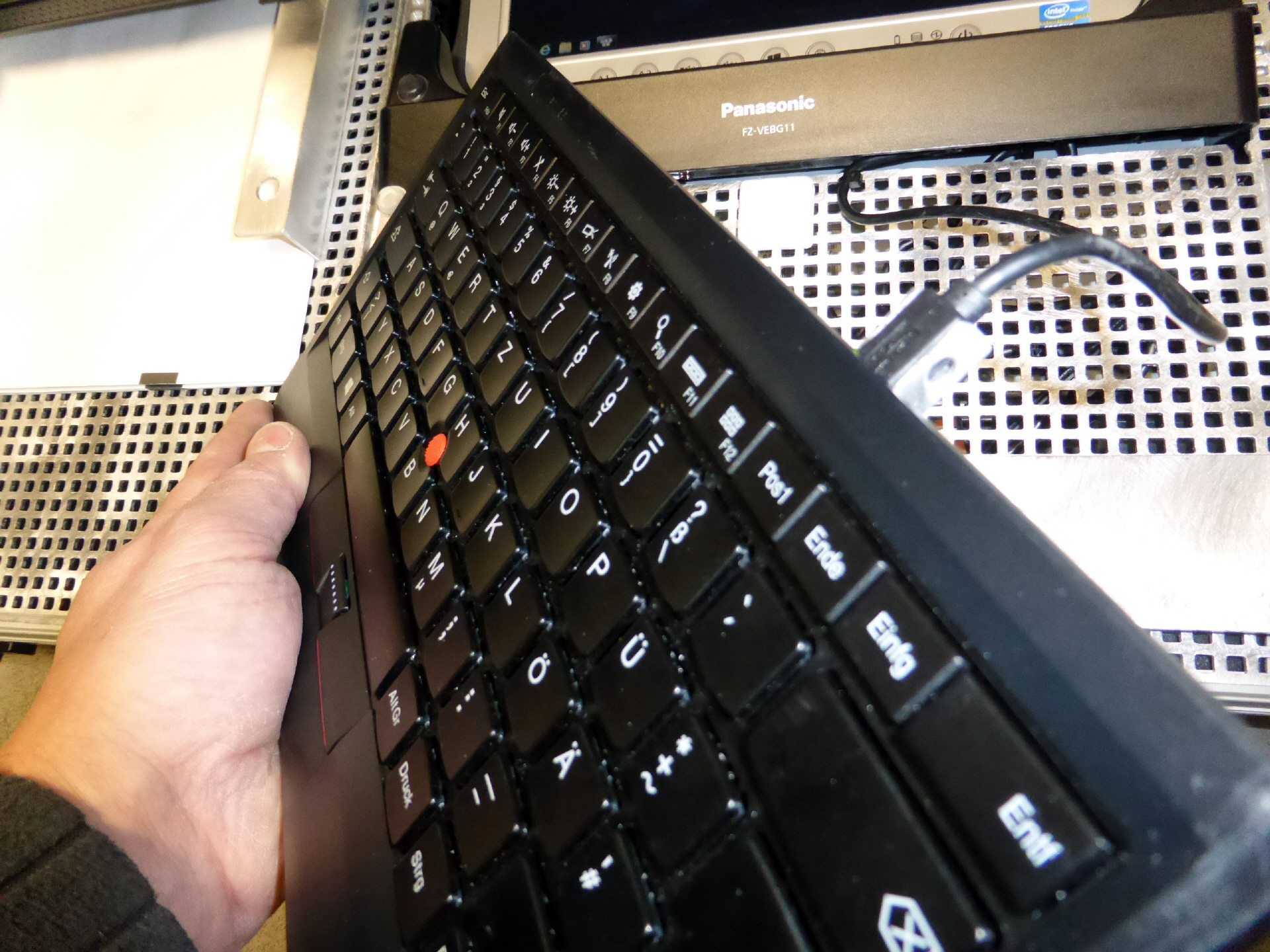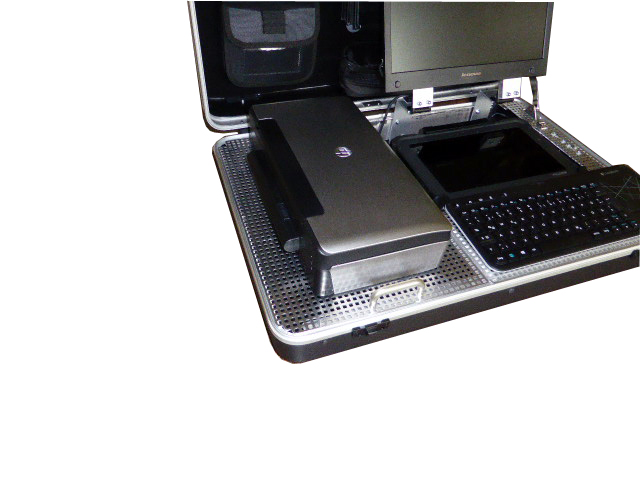 Konfiguration Boden Aufnahme für Drucker links mit 3M Dual-Lock-Befestigung, Aktiv-Docking-Station für Panasonic FZ-G1, Schwenkbarer Display Lenovo Thinkvision LT1421, Funktastatur Logitech mit Touchpad oder Lenovos
